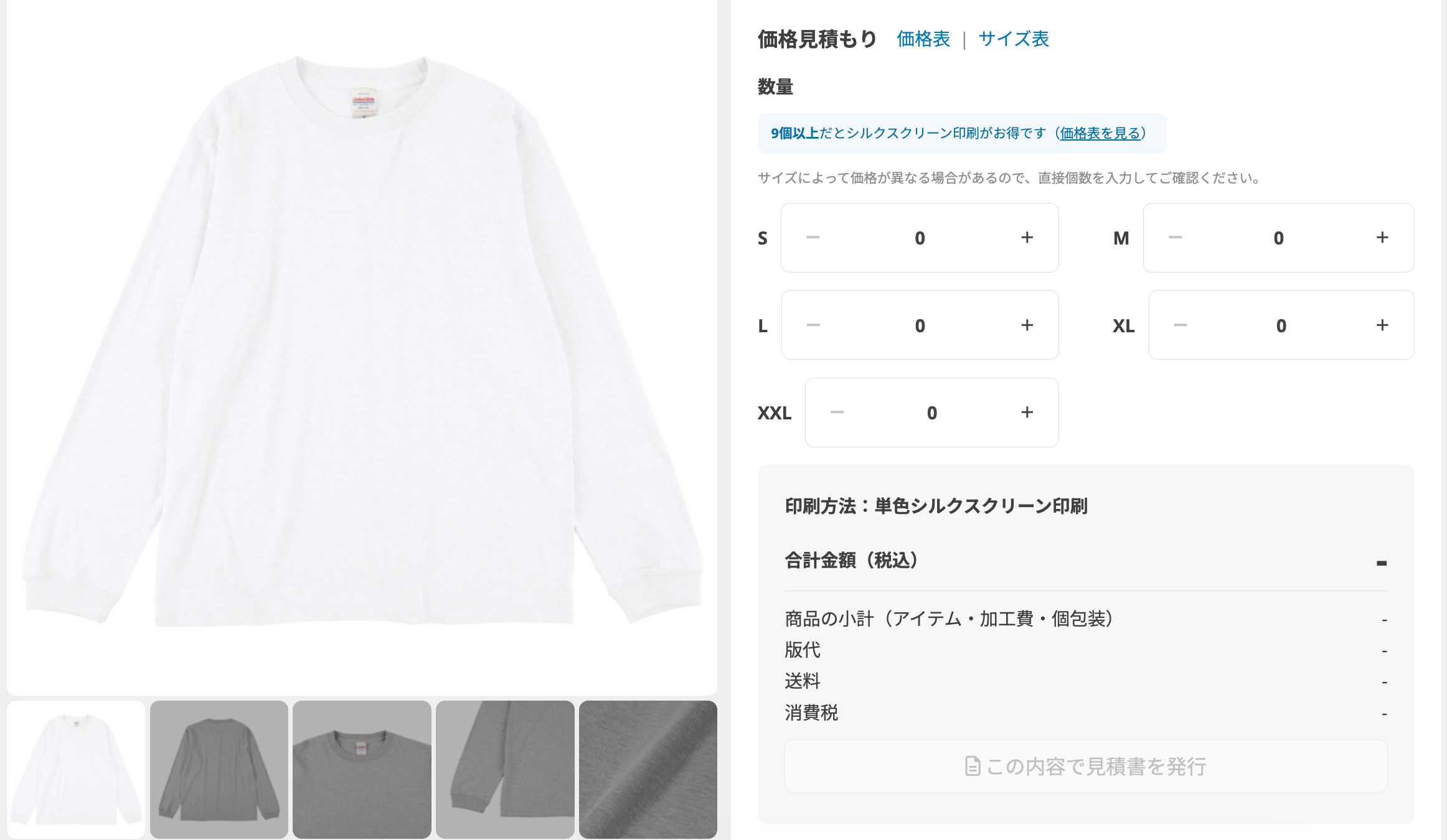 まとめ買い割引後の代金がいくらになるか確認したい 2026年04月14日 05:47 更新 各対象アイテムの詳細画面に設置している「価格見積もり」からご確認ください。印刷方法は「単色シルクスクリーン印刷」をご選択ください。 関連記事 フォローしているクリエイターのショップを一覧で見るには? まとめ買い割引ができるアイテムを教えて 同じデザイン(版)の再注文はできますか?